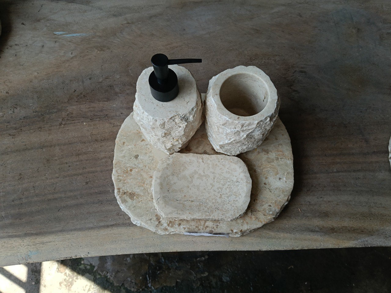 Handcrafted bathroom accessory set made from solid natural beige marble. Each piece features a raw stone exterior and smooth functional surfaces, highlighting the authentic texture of light marble.