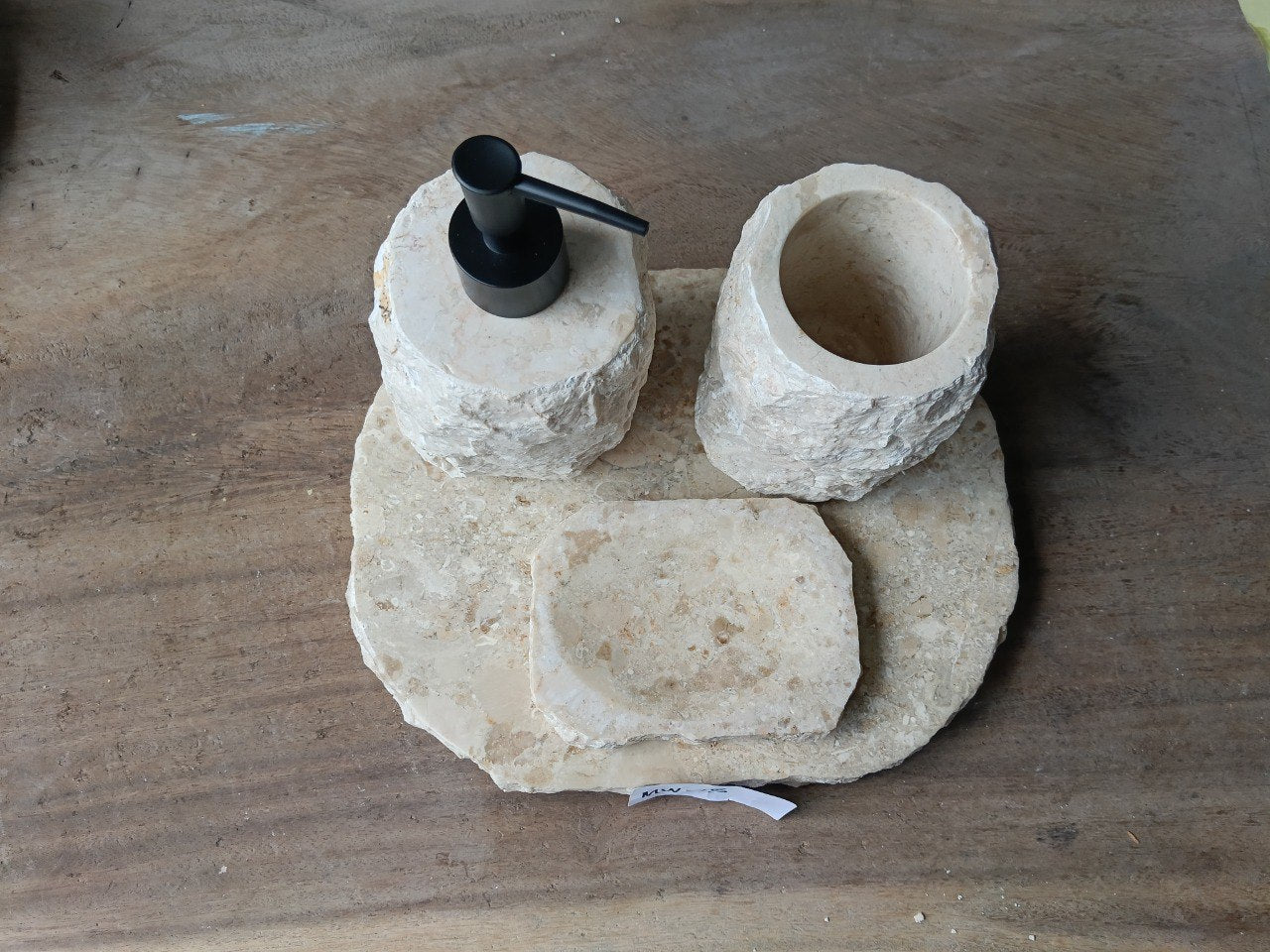 Handmade beige marble bathroom accessories set with organic structure and warm natural tone. Crafted from solid marble blocks, ensuring authenticity and durability.