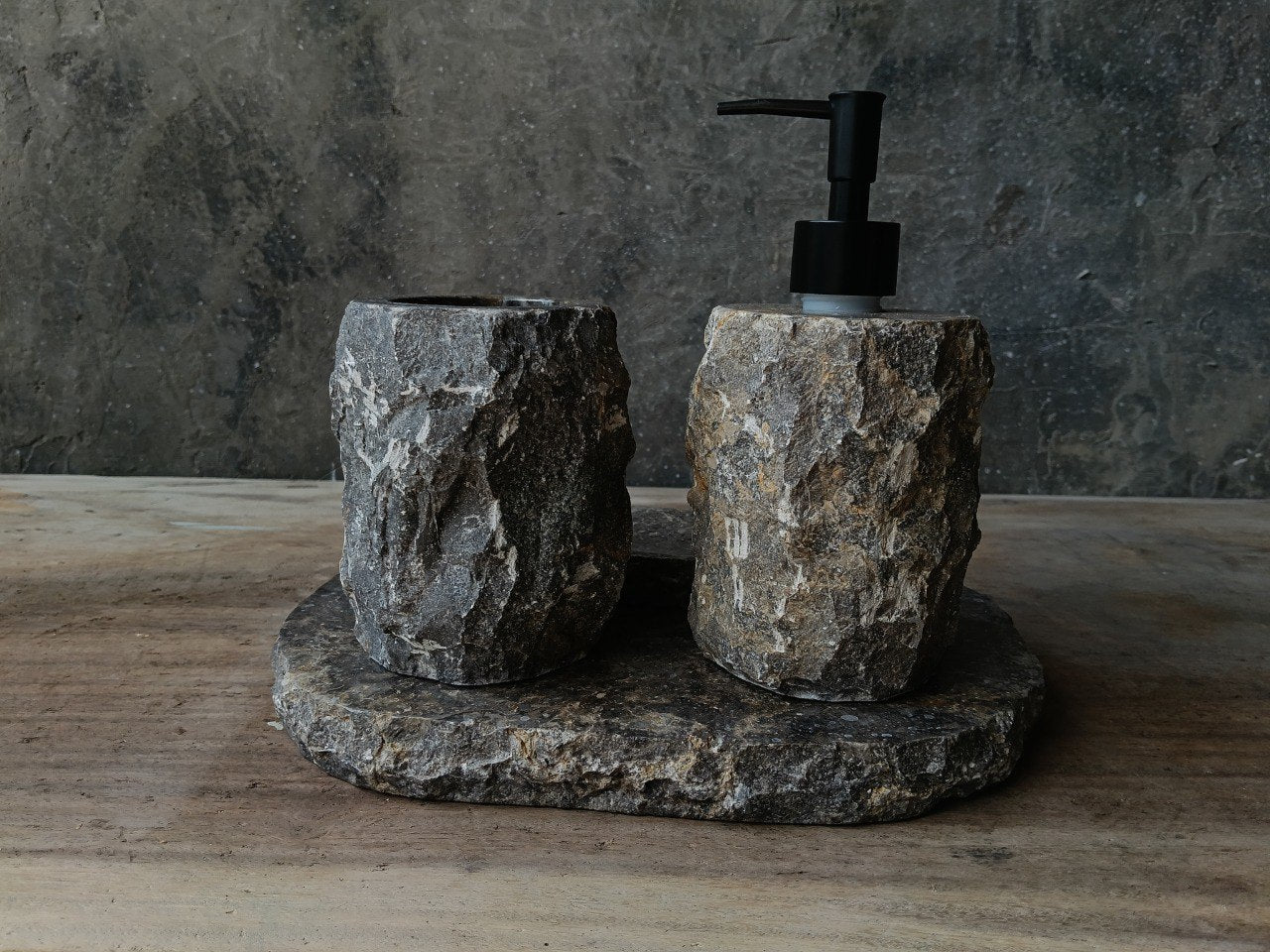 Includes dispenser, tumbler, soap dish and matching marble tray. Authentic stone texture and modern gray finish.