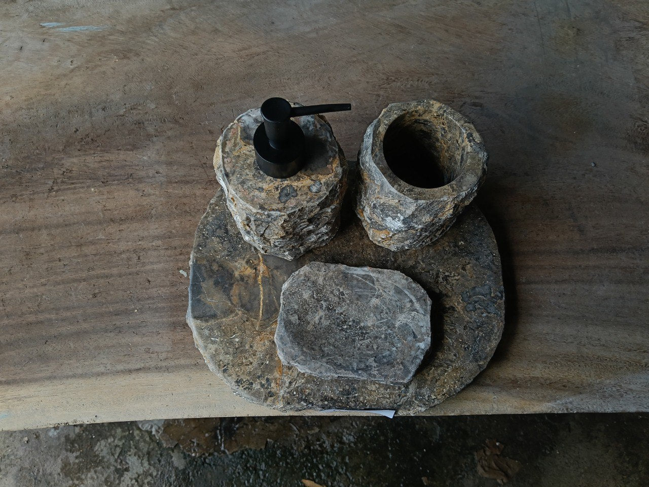 GMS-013 gray marble bathroom set carved from solid marble blocks with expressive chiseled texture. Each piece showcases unique gray veining and subtle stone variations.